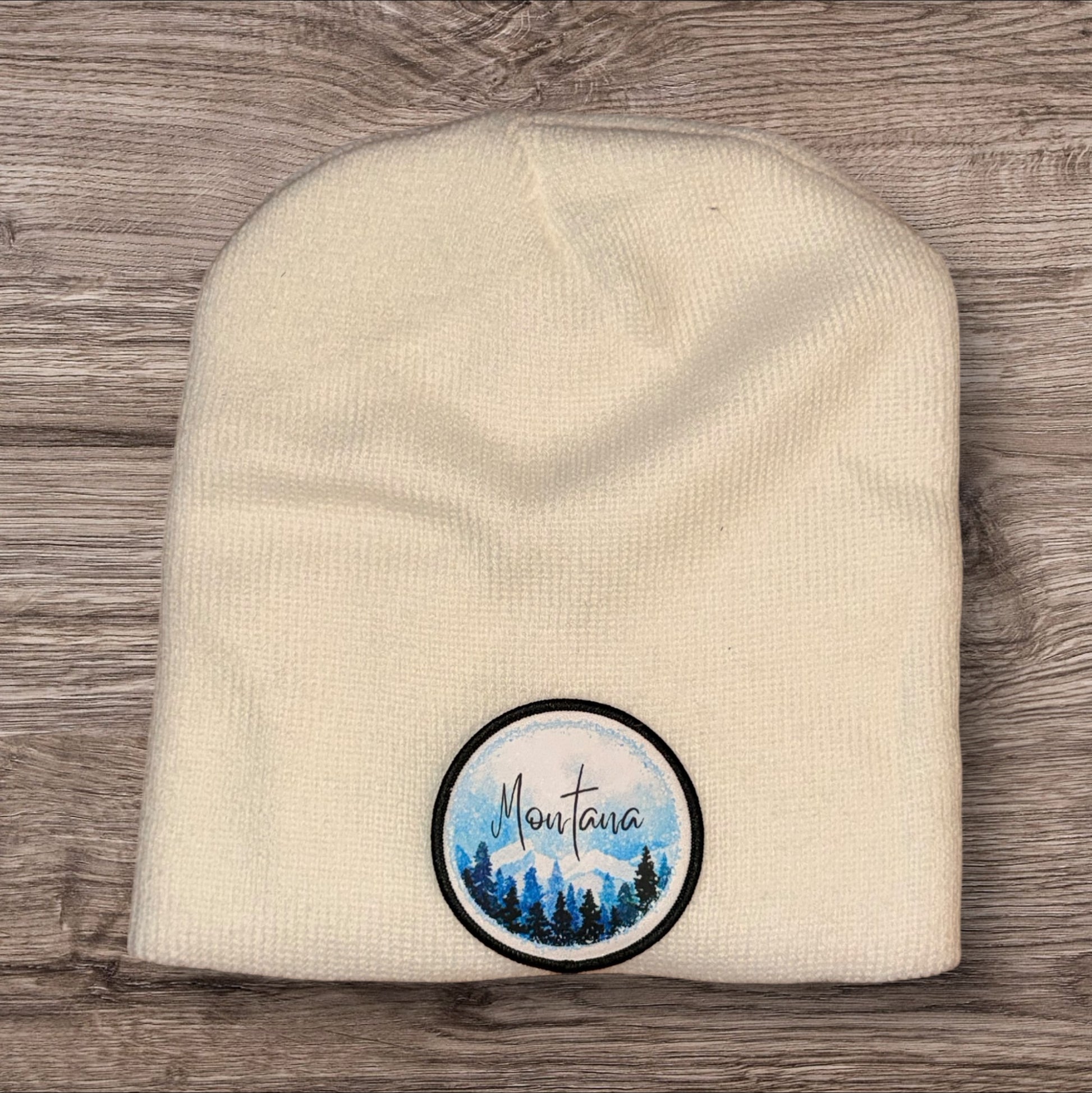 This cuffless knit beanie keeps things simple with a clean, minimal look. Made in a soft cream color, it features a printed Montana patch with mountain and pine details that quietly show your love for the state. Lightweight, comfortable, and easy to style, it’s perfect for everyday wear, layering, or anyone who prefers Montana pride without going full lumberjack.
